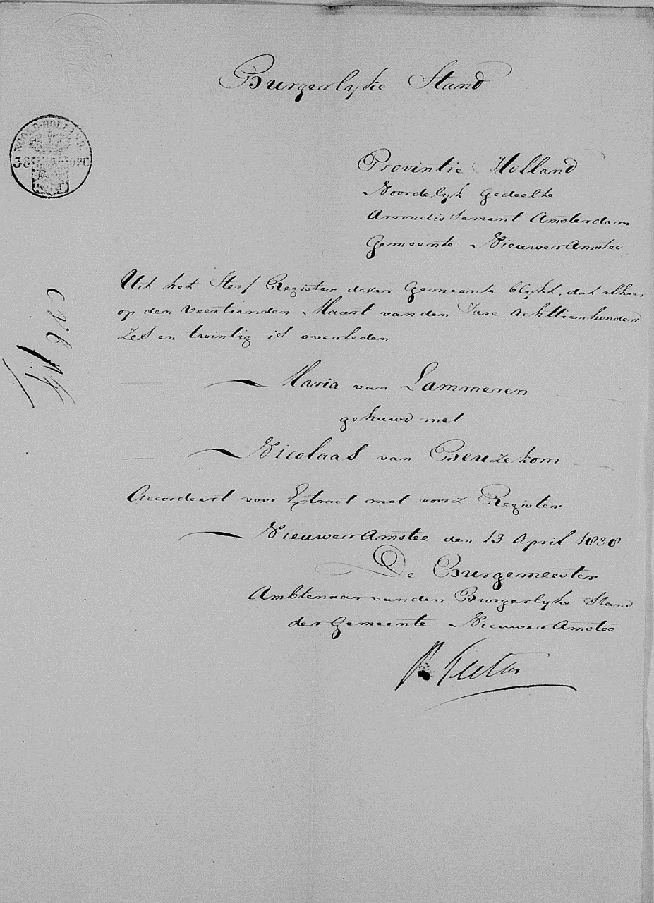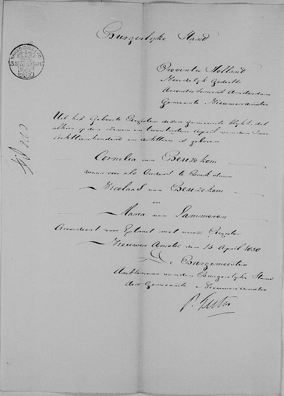 28-04-1838 Huw. bijlage (Extract Geboorte register Cornelia van Beuzekom)